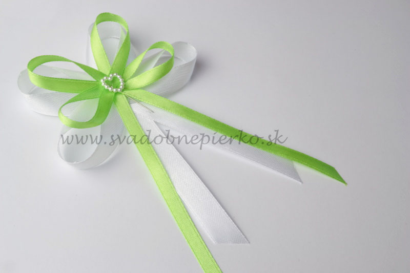 Veľké mašličkové pierko svetlozelenej farby s malým srdiečkom na špendlíku. Šírka 11cm dlžka 16cm.