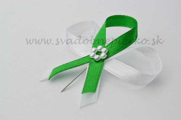 Svadobné pierko tmavozelenej farby, perličkový kvietok v strede. Pierko je  prichytené na špendlíku. Dĺžka 7cm šírka 6cm.