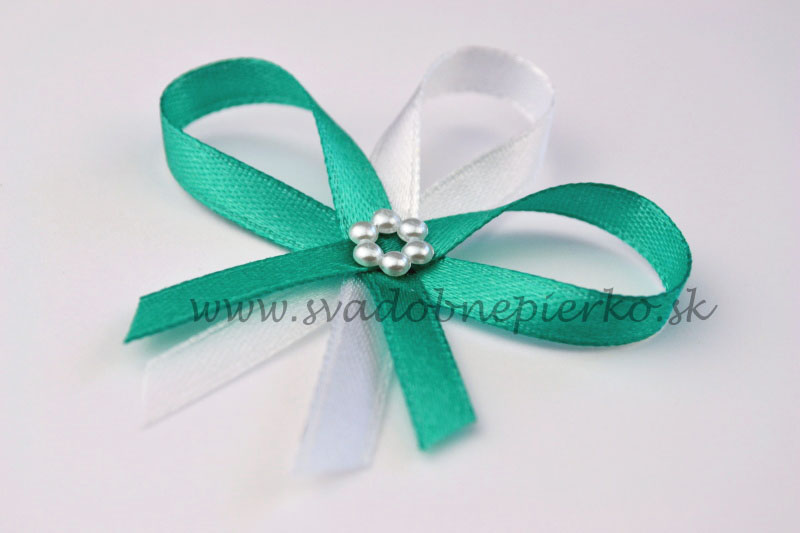 Svadobné pierko tyrkysovozelenej farby, perličkový kvietok v strede. Pierko je  prichytené na špendlíku. Dĺžka 7cm šírka 6cm.